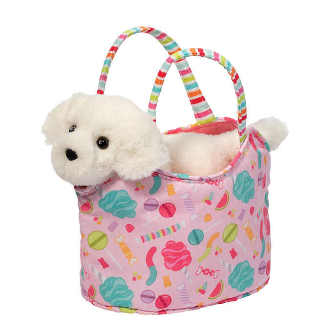 This playful plush friend is bubbly, excitable, and full of delicious energy. The pink bag pops with bright and mouthwatering candy designs!